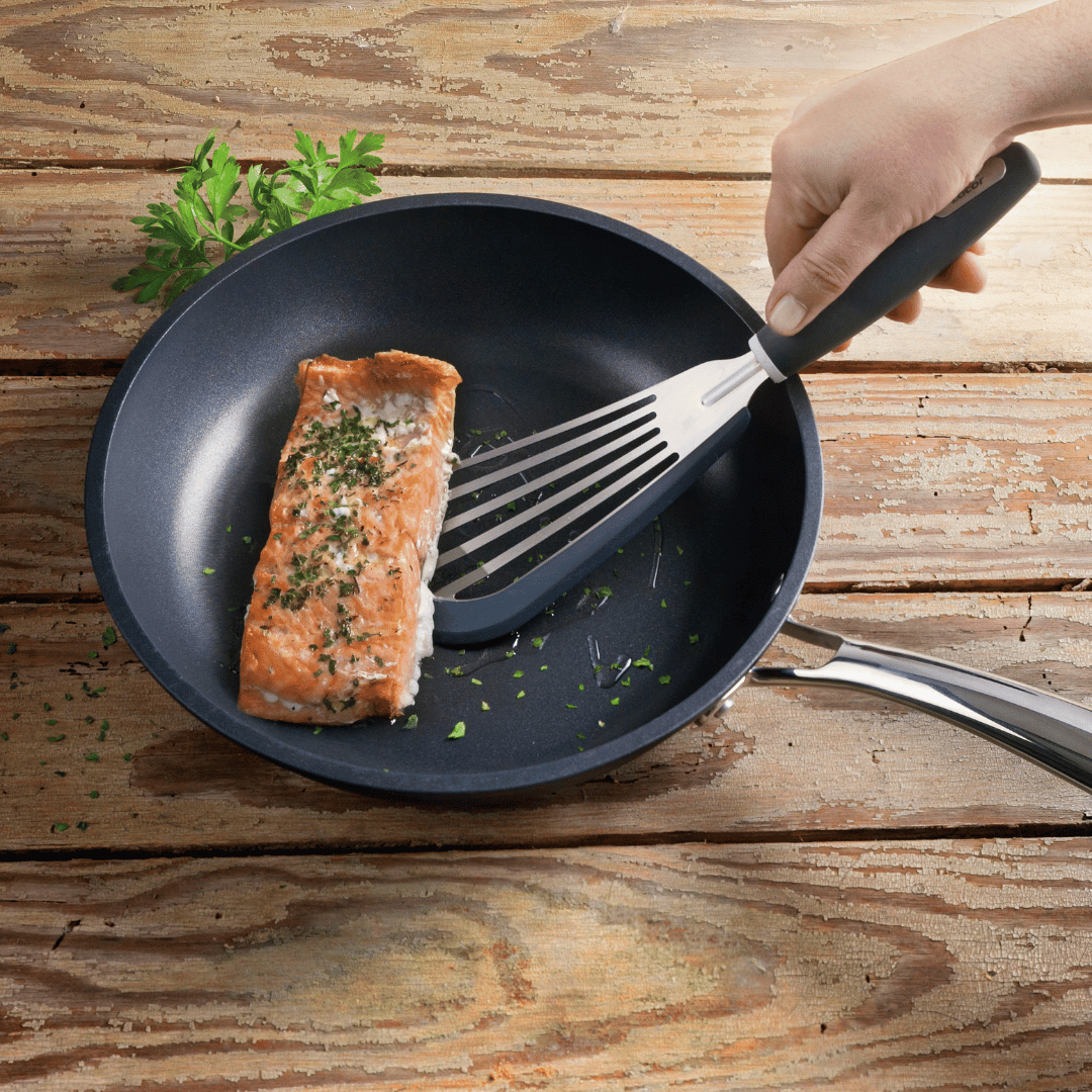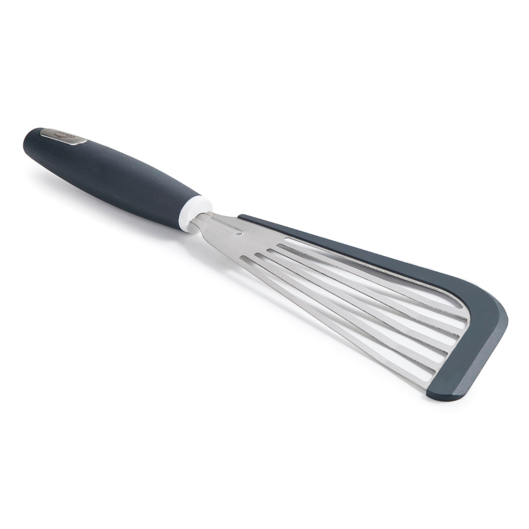 The Lacor grill spatula is made of 18/10 stainless steel and silicone. Its beveled edge helps to slide under food, making it ideal for turning them over.