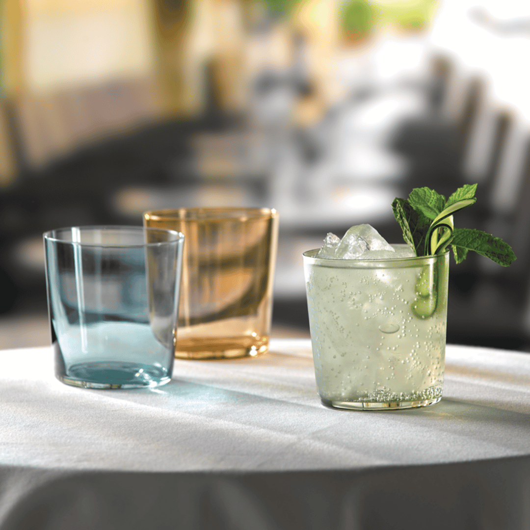 Cidra is a traditional Spanish style tumbler that is both lightweight and durable, available in clear, blue, green, grey, pink, and amber to complement any table setting. The sprayed colour is guaranteed for 3,000 wash cycles.