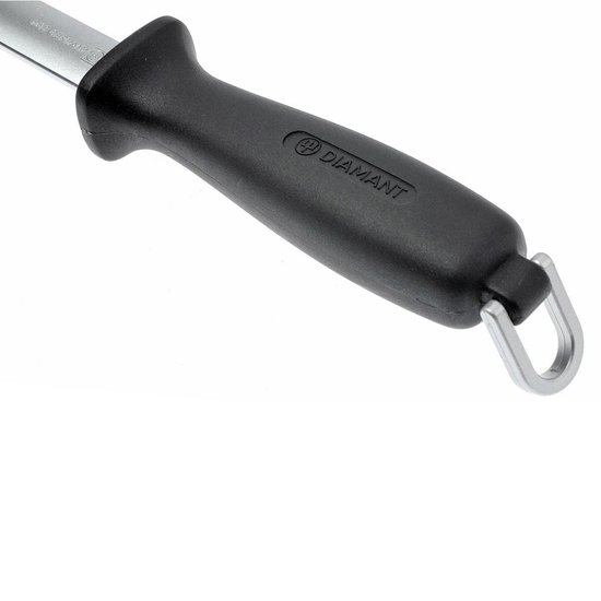 Fully forged from high carbon steel and coated with industrial diamonds, the steel is suitable for use with all knives while the metal hanging loop is a handy feature for either hanging at your belt, ready for instant use, or hanging to store away from the cluttered environment of a utensil drawer.