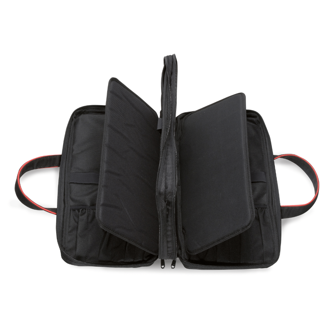 The Wüsthof knife case is a very luxurious chef's bag that can hold up to 20 pieces and additional accessories, in the three separate compartments that it offers. Inside the bag, you can secure all the knives with a practical Velcro strap.