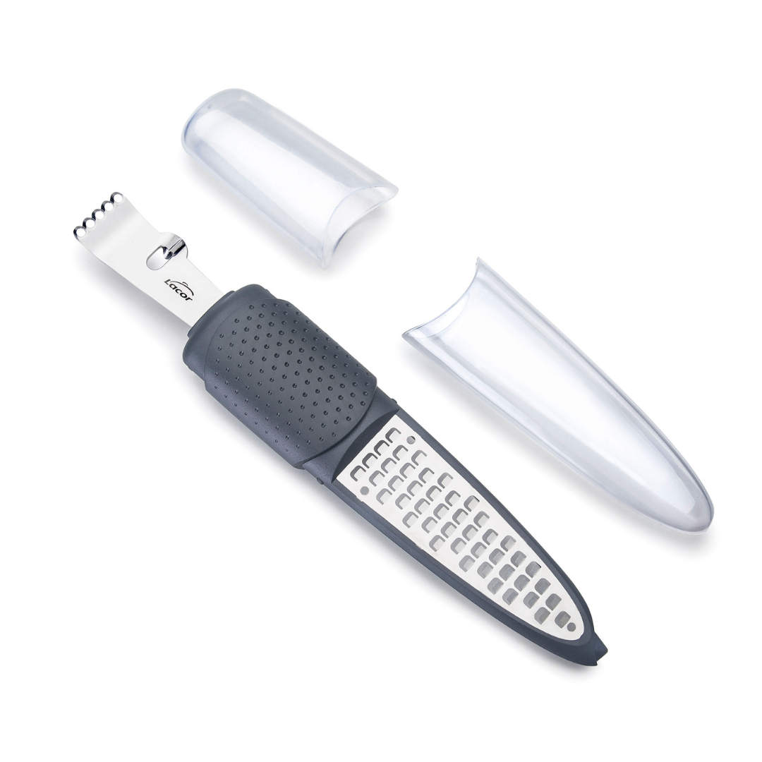 Ο τρίφτης πολλαπλών χρήσεων Lacor/Zester είναι το τέλειο εργαλείο για τη διακόσμηση πιάτων, γλυκών και κοκτέιλ. Επιτρέπει τον τεμαχισμό όλων των ειδών τροφίμων όπως αποξηραμένα φρούτα, σοκολάτα και κυρίως εσπεριδοειδή καθώς επιτρέπει διακοσμητικό τρίψιμο διαφόρων τύπων. Ο τρίφτης πολλαπλών χρήσεων, τρίβει τα εσπεριδοειδή φτιάχνοντας λωρίδες από λάιμ, λεμόνια και πορτοκάλια και περιλαμβάνει ένα αξεσουάρ για να κάνει ανατροπές για κοκτέιλ.