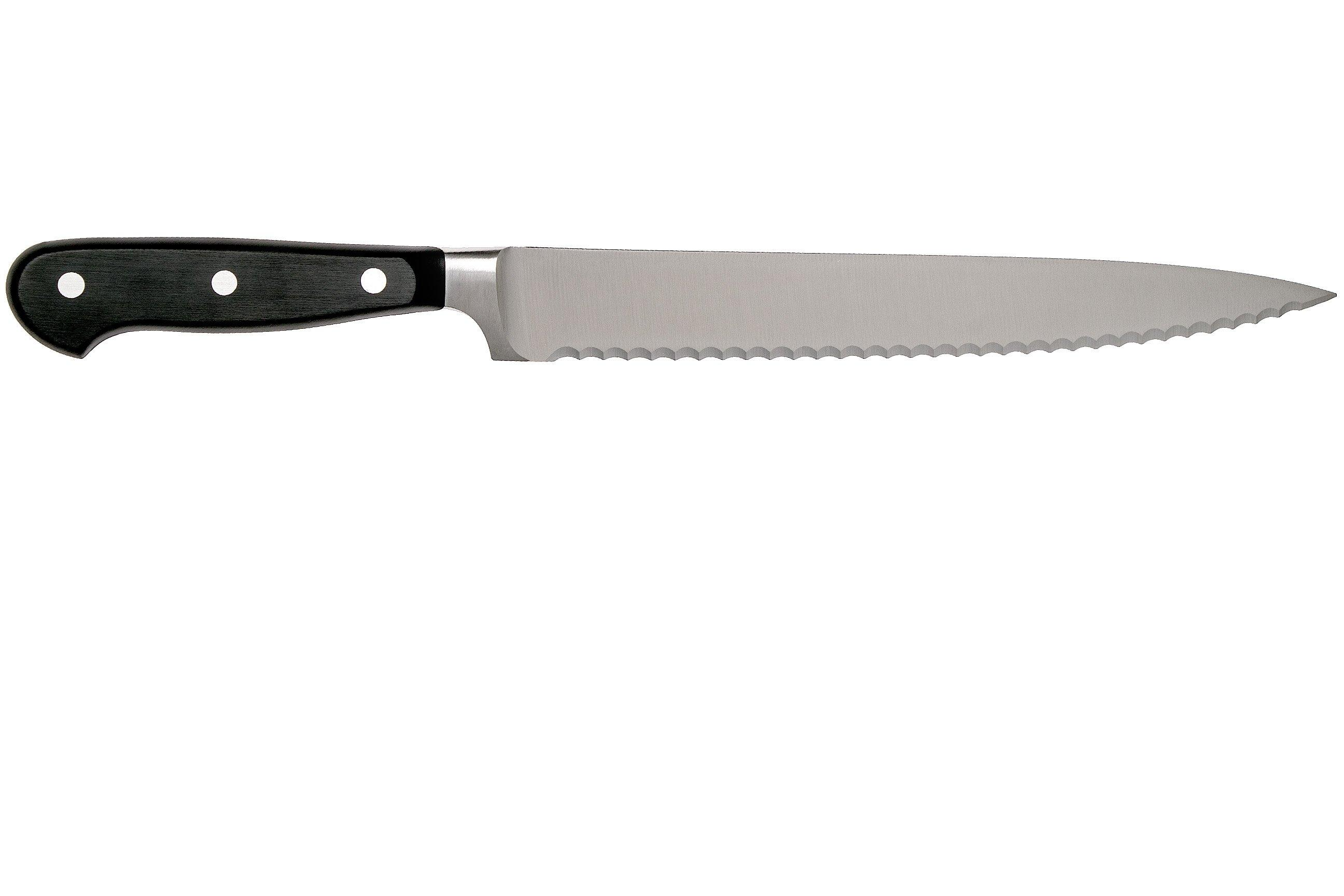 Το κλασικό οδοντωτό μαχαίρι κοπής 23 εκ. είναι το τέλειο μαχαίρι για πολλές εργασίες. Η πρόσθετη οδοντωτή άκρη έχει δόντια σαν πριόνι που επιτρέπουν στη λεπίδα να κόβει καθαρά ψητά και κρέατα διαφορετικών τύπων και μεγεθών σε λεπτές φέτες, καθώς και εσπεριδοειδή, ντομάτες, κουλούρια και ψωμί διαφορετικών τύπων σε λεπτές φέτες. Επίσης, η οδοντωτή άκρη επιτρέπει την κοπή ορισμένων φρούτων ή λαχανικών όπως τα πεπόνια.
