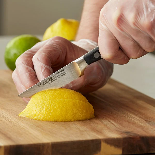 Αυτό το οδοντωτό μαχαίρι κοπής διαθέτει μια μικρή, στενή λεπίδα που λεπταίνει σε ένα σημείο στην άκρη. Είναι ιδανικό για το κόψιμο, τον τεμαχισμό και το ξεφλούδισμα μιας ποικιλίας προϊόντων όπως μήλα, ντομάτες, σκελίδες σκόρδου και φρέσκα βότανα. Οι οδοντωτές άκρες επιτρέπουν στη λεπίδα να κόβει καθαρά σε φέτες ευαίσθητα τρόφιμα όπως ψωμί και μαλακά λαχανικά ή φρούτα.