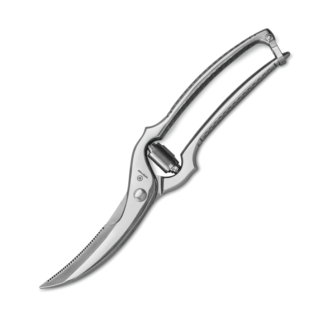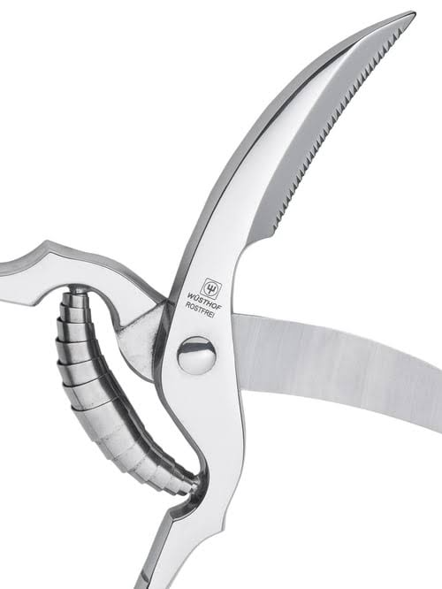 These heavy-duty, chrome-plated Wusthof curved shears are designed for skinning, cutting, and carving of chicken, turkey, duck, or goose. The spring-loaded mechanism makes for easier cutting thanks to its auto-opening feature.